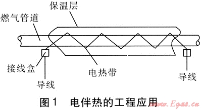 沈陽市蘇家屯地區(qū)以液化石油氣混空氣作為氣源,其部分庭院燃?xì)夤艿朗芊课萁ㄖY(jié)構(gòu)的限制,不得不采用沿外墻架空敷設(shè)的方式?,F(xiàn)以蘇家屯地區(qū)站前住宅小區(qū)庭院燃?xì)夤艿兰芸辗笤O(shè)電伴熱為例,對電伴熱的工程應(yīng)用加以闡述。本工程選用變功率式電熱帶,電伴熱的工程應(yīng)用見圖1。