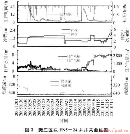 FN5-24井于2006年11月12日完鉆,完鉆井深783m。2007年4月14日壓裂3#煤層,壓裂井段721.6~727.5m,厚度5.9m,共注入活性水壓裂液551m3,石英砂45m3。2007年12月9日投產,排采134d解吸見氣,最高日產氣量達到693m3,產氣高峰時日產水3.5m3,維持30d后日產氣量迅速下降至211m3,水量0.9m3。解吸初期套壓高,出現(xiàn)頻繁俜抽導致井底壓力波動,低產判斷為由于井底壓力反復波動導致地層氣鎖,導致套壓、產氣量迅速下降(圖2)。2010年4月6日進行中等規(guī)模壓裂解堵,措施后183d,產氣量增加至2683m3,截至目前已穩(wěn)產24d,累計增產氣40×104m3。