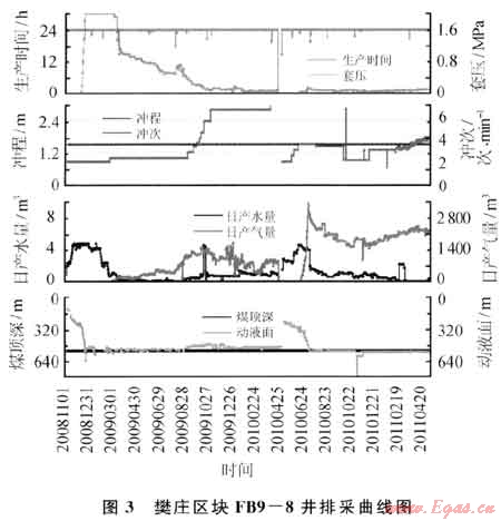 FB9-8井于2006年8月2日完鉆,完鉆井深585m。2008年6月27日壓裂3#煤層,壓裂井段523.8~528.8 m,厚度5.0 m,共注入活性水壓裂液356m3,石英砂30m3。2008年11月7日投產,排采40d解吸見氣,最高日產氣量達到1746m3,產氣高峰時日產水0.8m3,維持138 d后日產氣量迅速下降至466m3,水量0.1m3。判斷為地層氣鎖及地層應力閉合雙重影響,導致產量下降(圖3)。2010年5月1日進行大規(guī)模壓裂解堵,措施后65d,產氣量增加至2400m3,截至目前已穩(wěn)產312d,累計增產氣約54×104m3。