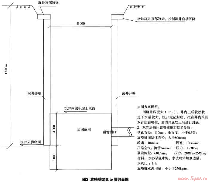 要加固沉井內(nèi)虛土,首先想到的是旋噴樁。眾所周知,旋噴樁是一種適合于加同軟土的很好地基處理方法,但其施工一般是在地面上進(jìn)行。旋噴樁若要在深度達(dá)17m、而其中上部還要架卒約13m的沉井內(nèi)施工卻是從未曾有人嘗試過。旋噴樁施工隊(duì)伍也擔(dān)心架空13m可能無法施工、加固效果很難保證。經(jīng)過仔細(xì)分析,我們大膽提出,只要采取的措施得法,旋噴樁是可以用于加固沉井內(nèi)虛土并起到止水作用的。通過現(xiàn)場指導(dǎo)施工,落實(shí)各項(xiàng)施工措施,最終證明,旋噴樁加固效果良好,虛土加固后,井底未出現(xiàn)涌砂、涌土現(xiàn)象,順利清除了井底虛土,保證了沉井順利封底。見圖1、圖2。