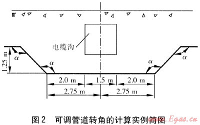 下面舉一個工程實例。在燃氣管道的縱斷圖設計中遇到一處電纜溝,采用可調(diào)管道轉(zhuǎn)角的計算方法進行計算,可調(diào)管道轉(zhuǎn)角的計算實例簡圖見圖2。