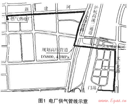 由于城市門站直線距離電廠不足3km,管線距離僅4.5km,為此電廠所需天然氣從市門站接出,并用專線直供電廠??紤]到電廠二期擴建及減少啟停和事故狀態(tài)下對天然氣管網的沖擊,管徑選擇為DN600。但是目前的城市門站只能滿足電廠一期工程的需要,為此一期供氣工程利用現狀高壓系統(tǒng),在現狀進站總管設置三通后,經計量(成撬設置)后直供電廠。同時與E游公司申請增加一路供應,配合電廠進行二期改造工程。擴容后的門站將不僅能滿足電廠擴建的需要而且也能滿足城市將來發(fā)展的需要。