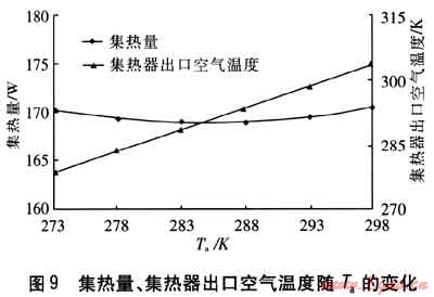 保持其他參數(shù)不變,集熱量、集熱器出口空氣溫度隨Ta的變化見圖9。由圖9可知,Ta增大,即集熱器進口空氣溫度增大,則集熱器出口空氣溫度相應(yīng)升高。