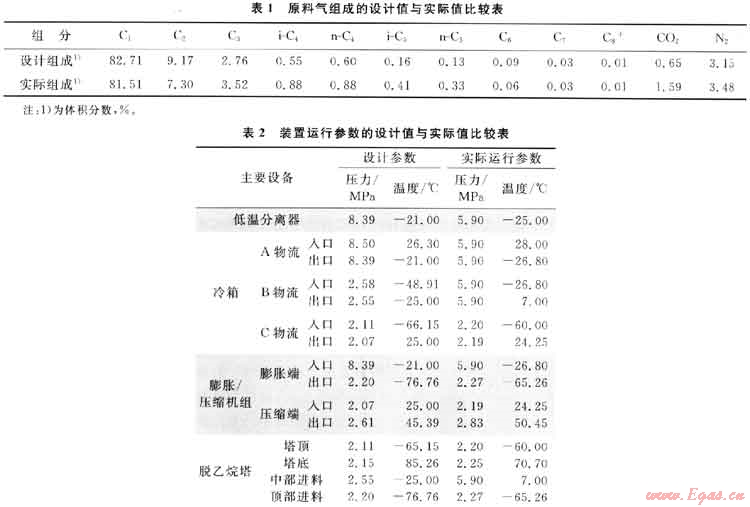 對比凝析氣處理裝置的天然氣的組成及裝置運行參數的設計值與實際值,可知原料氣的組成有所變化,天然氣變富,天然氣的處理量明顯增加,進氣壓力降低且生產裝置的運行參數也與設計參數有一定偏差。