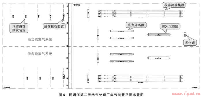 本著緊湊、美觀、安全及有利于操作、檢修的原則,阿姆河第二天然氣處理廠的集氣裝置在設(shè)備平面布置方面較第一天然氣處理廠集氣裝置作了很大改進(jìn),高、低含硫集氣系統(tǒng)成兩列對(duì)稱布置,同類設(shè)備相對(duì)集中,管架長(zhǎng)度短,裝置區(qū)整齊、美觀,預(yù)留操作空間。阿姆河第二天然氣處理廠集氣裝置平面布置情況如圖6所示。