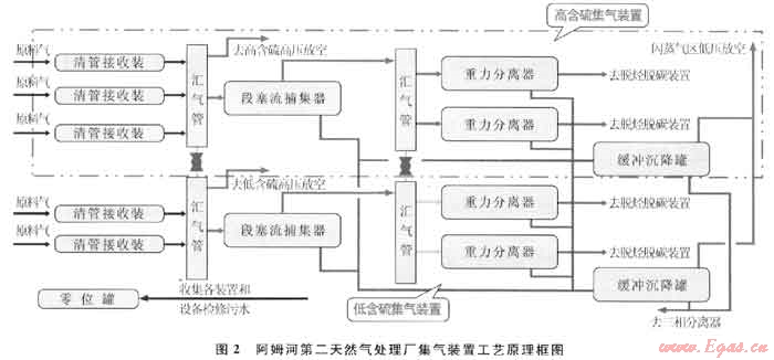 阿姆河第二天然氣處理廠集氣裝置按原料氣中硫化氫含量的高低,設(shè)置了兩套既獨(dú)立又聯(lián)通的天然氣處理系統(tǒng),分別與天然氣處理廠下游的酸氣處理系統(tǒng)對(duì)應(yīng),最大限度地滿足土庫(kù)曼斯坦當(dāng)?shù)貙?duì)環(huán)保的要求。
