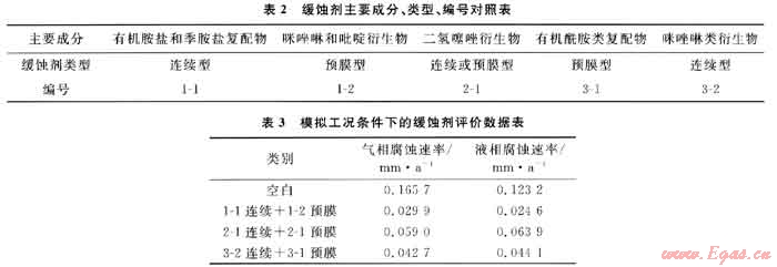 針對(duì)國(guó)外高含硫氣田已成熟應(yīng)用的商業(yè)產(chǎn)品,結(jié)合普光氣田濕氣集輸工藝的腐蝕特點(diǎn),選取了連續(xù)型和預(yù)膜型2種類(lèi)型緩蝕劑。根據(jù)緩蝕劑在高含硫介質(zhì)條件下的成膜特性,優(yōu)選了有機(jī)胺鹽和季胺鹽復(fù)配物、咪唑啉和吡啶衍生物、二氫噻唑衍生物、有機(jī)酰胺類(lèi)復(fù)配物、咪唑啉類(lèi)衍生物共5類(lèi)緩蝕劑產(chǎn)品,具體類(lèi)型見(jiàn)表2。
