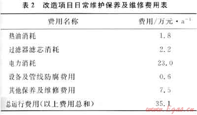 經(jīng)改造后,整個系統(tǒng)的日常維護保養(yǎng)及維修均納入氣田生產(chǎn)設(shè)施制度化管理的范圍內(nèi),按照目前氣田相同設(shè)備的維修和維護成本估算,其費用支出為35.1萬元/a,改造項目日常維護保養(yǎng)及維修費用列表見表2。