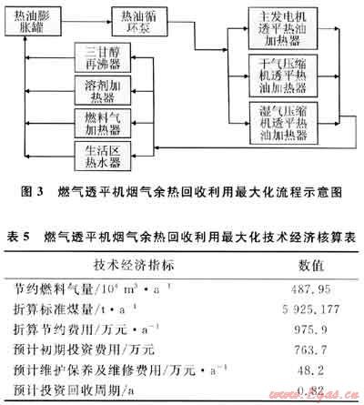 如果將這些熱源用戶全部改造成熱油換熱,并充分回收利用氣田上其他所有燃氣透平機得煙氣余熱,與本文2.3中涉及的熱油循環(huán)系統(tǒng)連成一體,那么將實現(xiàn)燃氣透平機煙氣余熱回收利用最大化,其流程如圖3所示。其相應(yīng)的技術(shù)經(jīng)濟核算見表5。這將會大量減少燃料氣的消耗量,提高能源的利用率,節(jié)約氣田開發(fā)生產(chǎn)成本,增加崖城氣田的經(jīng)濟效益,應(yīng)用前景廣闊。