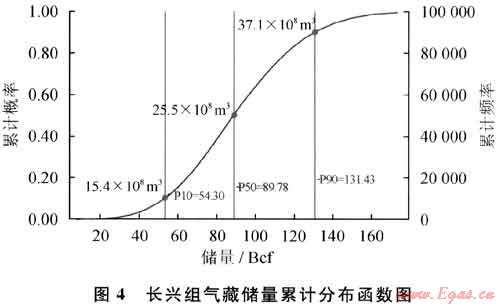 一旦確定代理方程,可以應(yīng)用蒙特卡洛模擬產(chǎn)生地質(zhì)儲量分布。對方程中的每個項,確定其分布函數(shù)。通常來說,儲層頂部深度、孔隙度、孔隙度下限值、氣水界面為三角分布,相變界限為均勻分布[2]。圖4為最終得到七里北長興組氣藏天然氣地質(zhì)儲量:P10=15.4×108m3;P50=25.5×108m3;P90=37.1×108m3。