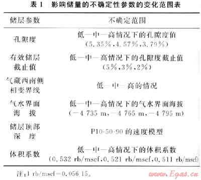 儲層孔隙度在±17%范圍內(nèi)變化。該變化范圍是根據(jù)本區(qū)所有開發(fā)井的非儲層巖層孔隙度的變化范圍計算得來的。表1列出了不確定范圍的主要參數(shù)。