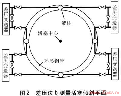 差壓法b測(cè)量活塞傾斜平面見圖2。在活塞上采用鋼管做一個(gè)大的圓環(huán),圓環(huán)的中心為活塞的中心位置,在圓環(huán)的4個(gè)等分位置設(shè)4個(gè)立管,所有立管和圓環(huán)皆連通,立管和圓環(huán)中均充有低揮發(fā)性的專用油品。將相鄰的兩個(gè)立管下部分別與差壓變送器的正負(fù)壓室相連,根據(jù)液柱的高差,計(jì)算得出傾斜量的大小。差壓變送器鄰近測(cè)壓點(diǎn)安裝。