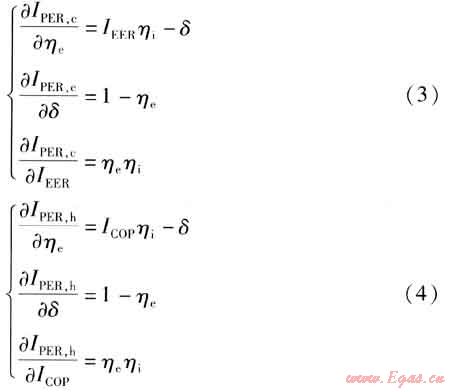 由式(1)、(2)可知,燃氣機熱泵的一次能源利用率與熱泵的性能系數(shù)、燃氣機的熱效率及余熱回收系數(shù)有關,各因素對PER的影響程度不同。IPER,c、IPER,h分別對ηe、IEER或ICOP求偏導,得: