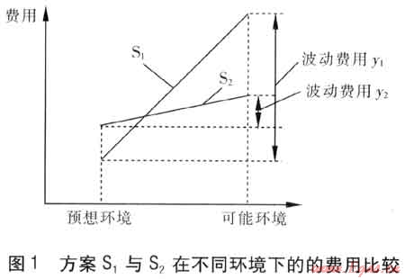 圖1中,波動費用是指當預想環(huán)境變化至可能環(huán)境后,方案S1、S2為了適應變化而增加的費用??梢婋m然在預想環(huán)境下S1比S2投資費用省,但當未來環(huán)境發(fā)生變化后,S1比S2付出了更多的追加費用(y1-y2),因此S2比S1具有更好的靈活性與適應性。柔性規(guī)劃的意義在于通過在規(guī)劃前期增加少量資金投入,使系統(tǒng)能夠更加適應未來可能的變化,即無論未來環(huán)境如何變化,柔性規(guī)劃方案都能以較少的追加投入來適應這種變化。采用柔性規(guī)劃方法總體上可以節(jié)省大量的資金和物資。