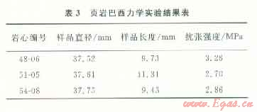 選取頁(yè)巖基質(zhì)巖石樣品,通過實(shí)驗(yàn)測(cè)量,頁(yè)巖樣品抗張強(qiáng)度介于2~4 MPa,平均為2.94 MPa(表3)。