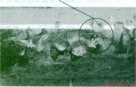 2012年4月,我公司接報(bào)坪山某路段有燃?xì)庑孤?。?jīng)現(xiàn)場(chǎng)檢測(cè)確認(rèn)泄漏部位后,進(jìn)行開(kāi)挖探查。該段為聚乙烯管道,緊鄰路燈,隨橋跨河敷設(shè),埋深約80 crn,且周邊土壤較為潮濕,管道外加鋼質(zhì)套管保護(hù)。開(kāi)挖后發(fā)現(xiàn)PE管道與鋼質(zhì)套管的間隙被白蟻蟻巢填滿(mǎn)(見(jiàn)圖l)。經(jīng)現(xiàn)場(chǎng)清理后發(fā)現(xiàn)該段PE燃?xì)夤艿朗馨紫佒g大面積破壞,并確認(rèn)燃?xì)庾园紫佒g破壞穿孔處泄漏(見(jiàn)圖2)。