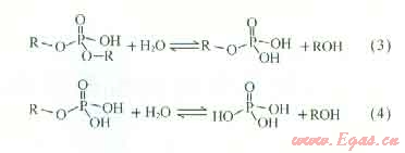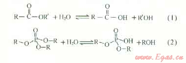 有機酯的水解反應為?;忌系挠H核取代,羧酸酯水解反應方程式為式(1)[11],產(chǎn)物為羧酸和飽和醇;磷酸酯水解反應方程式為式(2)~(4),產(chǎn)物為磷酸和飽和醇??梢?,有機酯水解后產(chǎn)物為有機酸和醇類物質。由于有機酸為酸化常用體系,有助于酸化,同時醇類物質具有較好的潤濕延展性,能降低表面張力。因此,有機酯不僅不會對儲層造成傷害,其水解產(chǎn)物有機酸還能起到一定的酸化效果,醇類還能解除水鎖現(xiàn)象。