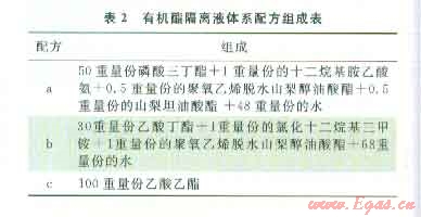 根據(jù)有機酯隔離液體系的組成,設計了3種具體的配方(表2),開展了配伍性和隔離效果評價。