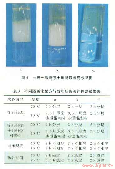 將各隔離液配方分別與酸和壓裂液混合,在低溫(20℃)和高溫(80℃)情況下靜置觀察,其結果表明有機酯隔離液能有效隔離前置酸和壓裂液(圖4和表3)。