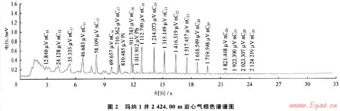 在2423.37~2428.11m井段鉆井取心,獲熒光級巖心2.38m,巖心出筒時新鮮斷面具芳烴氣味,噴照熒光5%,淡黃色,弱發(fā)光,系列對比7級,乳白色,巖心斷面具弱水濕感,滴水擴散,浸水試驗局部冒氣,呈串珠狀。氣測全烴由0.779 2%↑98.5637%,組分出至nC5,氣測正規(guī)化圖版解釋為氣層(圖1-a),氣測形態(tài)法解釋為氣層或油層(圖1-b)。熱解氣相色譜(圖2)氣態(tài)聯(lián)合峰(C8~C12)明顯,正構(gòu)烷烴組分分布較完整,基線較平直,呈規(guī)則梳狀,碳數(shù)范圍為nC11~nC30,其中輕組分占優(yōu)勢,主峰碳數(shù)為nC14~nC16,∑nC21-/∑nC22+介于4.24~17.65,總峰面積介于14041~28786μV·s,含烴量較大,反映出氣層特征。