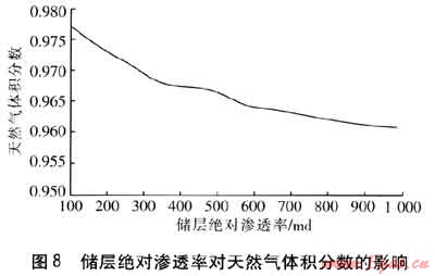 回采到第145天時(shí),儲層絕對滲透率對采出氣中天然氣體積分?jǐn)?shù)的影響見圖8。由圖8可知,回采相同時(shí)間時(shí),儲層絕對滲透率越大,采出氣中天然氣的體積分?jǐn)?shù)越小。因?yàn)閮咏^對滲透率越大,地層的水力傳導(dǎo)性越好,氮?dú)馀c天然氣的擴(kuò)散越容易,混合程度越大。