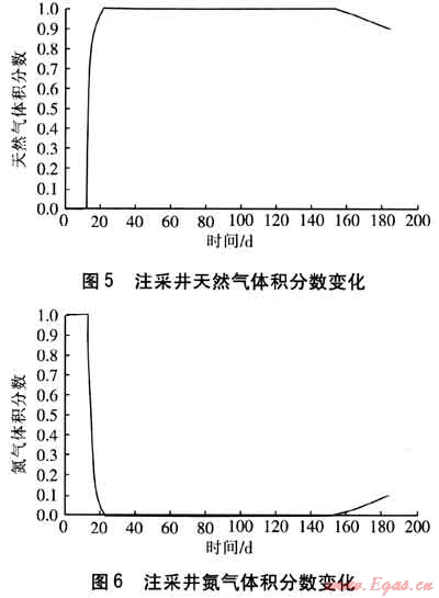 圖5、6為儲氣庫運(yùn)行過程中注采井天然氣及氮?dú)怏w積分?jǐn)?shù)變化情況。最初12d為注入氮?dú)怆A段,天然氣的濃度為0。第13天開始注入天然氣,由于氣體擴(kuò)散,注采井處的天然氣濃度會逐漸變大,井口處天然氣濃度上升很快。運(yùn)行到第22天時(shí),井口處天然氣體積分?jǐn)?shù)達(dá)到1,此后井口處一直為純天然氣。在回采過程中,初始時(shí)由于距注采井一定距離內(nèi)為純天然氣區(qū),采出氣中天然氣體積分?jǐn)?shù)仍為1。隨著采氣的進(jìn)行,天然氣與氮?dú)獾幕旌蠋Р粩嘞蜃⒉删幰苿?dòng),回采至第148天時(shí),開始出現(xiàn)氮?dú)?,此時(shí)氮?dú)怏w積分?jǐn)?shù)為3×10-6。隨著回采的繼續(xù)進(jìn)行,采出氣中氮?dú)夂吭絹碓酱螅酵V够夭蓵r(shí),氮?dú)怏w積分?jǐn)?shù)達(dá)9.665%。