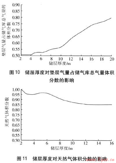 由文獻(xiàn)[9]中的模擬可知,儲層越厚,地層平均壓力及井點(diǎn)壓力升高得越緩慢,因此,儲層越厚,對注氣量的提高越有利。然而,在相同注氣量及注采速度下,儲層越厚,注氣過程中,氣體驅(qū)開水的面積越小,那么在回采過程中,水會更快進(jìn)入注采井,使注采井含水飽和度更快達(dá)到0.5,此時(shí)應(yīng)停止采氣,則滯留在儲氣庫中的墊層氣量就越多(見圖10)。
