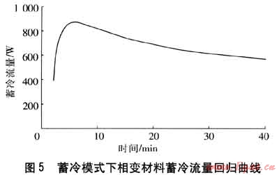 Φc與P之差即為相變材料蓄冷流量(回歸曲線見圖5),由于前2min實驗數(shù)據(jù)不穩(wěn)定且存在Φc<P的情況,因此曲線從第2min給出。隨著運行時間的推移,壓縮機逐漸穩(wěn)定運行,制冷劑與相變材料的換熱流量不斷增大,初期提取的熱量為液態(tài)相變材料的液相顯熱,當(dāng)相變材料溫度進(jìn)入相變區(qū)間時,制冷劑取出的熱量為相變潛熱。