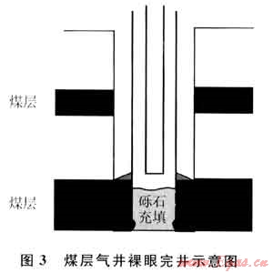 裸眼完井(圖3)是指將套管下在生產(chǎn)段煤層頂,然后鉆開煤層,不進行壓裂等增產(chǎn)措施,產(chǎn)氣煤層保持裸眼或用礫石充填。裸眼完井是一種最基本、最簡單、費用最低的完井方式,適合于埋深較淺、滲透性能好的單目的層,煤儲層穩(wěn)定且不容易垮塌。