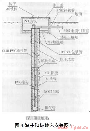 公司于2011年3月苗‘先啟動了Ⅸ域二的深井陽極電流保護(hù)工程。經(jīng)計算管道保護(hù)面積為19 631m2,設(shè)計保護(hù)電流密度為lomA/m2,保護(hù)總電流為196A,在南浦氣化站和位于車站大道的公用集團(tuán)內(nèi)各設(shè)置1座深井陽極陰極保護(hù)站。每個站內(nèi)設(shè)l00A/100V恒電位儀2臺,-開-備。在站內(nèi)距離管線50m~100m的低洼潮濕、土層較厚處鉆建直立式陽極地床,升深60m,井內(nèi)裝分段預(yù)制型陽極體7組,規(guī)格為Ф325×6 000,內(nèi)裝Ф75×1 500高硅鑄鐵陽極3支。將高硅鑄鐵陽極、高性能碳素填料,PVC排氣管,部分陽極引線電纜,井套管組合裝配為-體,便于運(yùn)輸和安裝,并可保證裝配精度和質(zhì)量(圖4)。每500m左有設(shè)置-個測試樁或在原有閥門井內(nèi)設(shè)置測試點。對于平行或跨越管道按-定間距或在最接近處作均壓處理,使電位分布均衡。