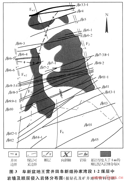 王營井田地處阜新盆地(屬晚中生代盆地)中部,位于軸線呈北東東向王營向斜被北北西走向的F2、FW2斷層所夾的地塹狀斷塊內(nèi)。經(jīng)多次活動且斷層泥發(fā)育的F2、FW2斷層分別構成井田的東、西邊界,北界大體位于βμ3巖墻一線,南界為煤層可采邊界。該井田含煤巖系為下白堊統(tǒng)阜新組,煤種以長焰煤為主,煤層氣成藏條件較好,煤層氣藏的成因類型屬水動力封閉-復合圈閉煤層氣藏。該區(qū)是我國煤層氣早期開發(fā)選區(qū)之一,也是我國首例在礦井中發(fā)現(xiàn)、研究和進行商業(yè)開發(fā)的煤層氣田之一。生產(chǎn)礦井為煤層氣富集地質(zhì)因素的深入研究提供了方便條件。