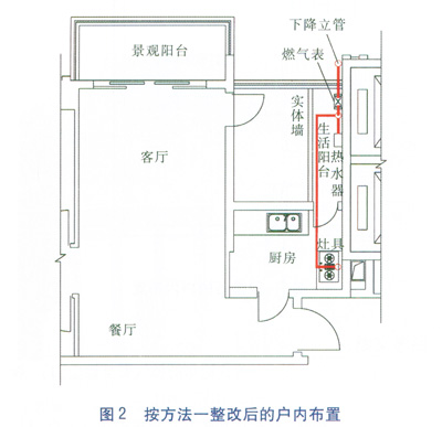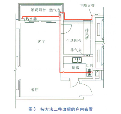 這個方法的優(yōu)點是先前做好的燃氣設施不用重新布置,也基本滿足了用氣條件。其缺點是敞開式生活陽臺變小了,廚房的窗戶變成門,造成櫥柜變少了,業(yè)主意見不一。