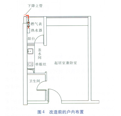 舉例:有一公寓戶型,茶水間作為廚房用,布置有煙道、單眼灶和洗手盆,并與起居室兼臥室相連。由于此戶型衛(wèi)生間是暗室,因此,熱水器只能安裝在陽臺上,燃氣立管安裝在陽臺外側,燃氣表安裝在陽臺上,表前燃氣管道沿墻架空敷設,表后燃氣管道采用銅管直埋于墻壁,并引至熱水器。GB 50028—2006第10.4.2條規(guī)定,居民生活用氣設備嚴禁設置在臥室內(nèi)。因此,此戶型的茶水間不具備用氣條件,原設計時我們也沒有將燃氣管道引入茶水間,而只供熱水器使用燃氣。改造前的戶內(nèi)布置見圖4。
