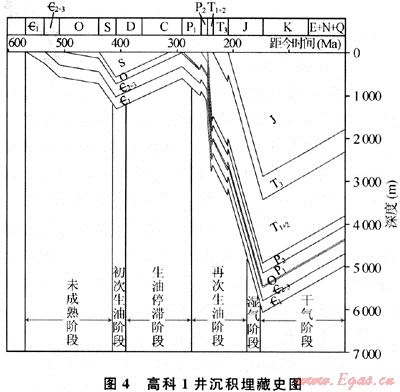 根據(jù)高科1井的沉積埋藏史圖(圖4)可見(jiàn),樂(lè)山-龍女寺古隆起區(qū)下寒武統(tǒng)源巖經(jīng)歷了埋藏-抬升(剝蝕)-再埋藏-再抬升的演化過(guò)程。其有機(jī)質(zhì)生烴史可分為三期:第一期為初始生烴階段:高科1井下寒武統(tǒng)源巖在志留紀(jì)末R。值已達(dá)0.7%,處于未成熟一低成熟生烴期;第二期為生烴停滯階段,由于加里東運(yùn)動(dòng)的抬升作用,該井下寒武統(tǒng)源巖埋深變淺并遭受剝蝕,古地溫降低,有機(jī)質(zhì)進(jìn)入生烴滯流階段;第三期為“二次生烴”階段:從二疊系開(kāi)始至二疊系末,下寒武統(tǒng)源巖埋藏深度及其所具有的古地溫已超過(guò)了初始生烴階段,源巖進(jìn)入了二次生烴階段。此時(shí),高科1井毛。源巖Ro值已達(dá)0.71%,有機(jī)質(zhì)開(kāi)始繼續(xù)生烴。印支末期,高科1井