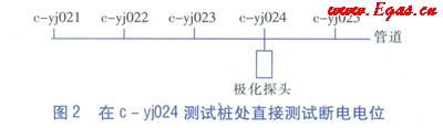 a.斷掉c-yj024測試樁的兩組犧牲陽極,等待管道完全去極化,即去除犧牲陽極對c-yj024測試樁處管道的影響,使c-yj024測試樁相當于管道任意點的直接測試樁。