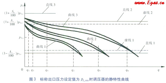 調(diào)壓器A在上述標(biāo)稱出口壓力設(shè)定值p2,int=3kPa參數(shù)條件下的靜特性曲線圖見圖4。