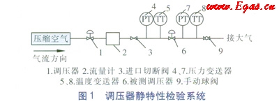 為了確保檢驗(yàn)過程的安全性,調(diào)壓器靜特性檢驗(yàn)的試驗(yàn)介質(zhì)采用壓縮空氣。調(diào)壓器靜特性檢驗(yàn)過程中,由調(diào)壓器1調(diào)節(jié)被測(cè)調(diào)壓器6的進(jìn)口壓力,由壓力變送器4測(cè)量被測(cè)調(diào)壓器6的進(jìn)口壓力值;通過手動(dòng)球閥9來調(diào)節(jié)通過被測(cè)調(diào)壓器6的壓縮空氣流量,流量值由流量計(jì)2測(cè)量,同時(shí)讀取由壓力變送器7測(cè)得的被測(cè)調(diào)壓器6實(shí)時(shí)的出口壓力值。在檢驗(yàn)過程中,進(jìn)口切斷閥3保持開啟狀態(tài),檢驗(yàn)結(jié)束后關(guān)閉進(jìn)口切斷閥3。如果在檢驗(yàn)過程中出現(xiàn)異常,則關(guān)閉進(jìn)口切斷閥3,故障排除后再開啟進(jìn)口切斷閥3繼續(xù)檢驗(yàn)。溫度變送器5和8測(cè)量被測(cè)調(diào)壓器6進(jìn)口和出口的壓縮空氣溫度。