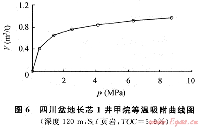 圖6為長(zhǎng)芯1井120m處所取巖心的等溫吸附曲線(70℃等溫),該樣品為志留系龍馬溪組黑色頁(yè)巖,有機(jī)碳含量為5.9%,成熟度為3.26%。在70℃等溫條件下,隨著壓力增高,頁(yè)巖吸附甲烷的能力(V)逐漸增大,在壓力達(dá)到8.5MPa時(shí),頁(yè)巖的甲烷吸附能力達(dá)到1m3/t。通過(guò)與美國(guó)5大頁(yè)巖氣盆地的頁(yè)巖等溫吸附曲線對(duì)比可以發(fā)現(xiàn),長(zhǎng)芯1井志留系頁(yè)巖的吸附能力除與圣胡安盆地白堊系Lewis頁(yè)巖相近外,均低于其他盆地的頁(yè)巖。究其原因,筆者認(rèn)為很可能與成熟度有關(guān)。目前發(fā)現(xiàn)的進(jìn)行商業(yè)開(kāi)發(fā)的美國(guó)5大頁(yè)巖氣盆地的頁(yè)巖,成熟度普遍不高,介于0.4%~1.9%之間。而熱成因的頁(yè)巖氣藏,頁(yè)巖成熟度較高,大多在1.1%以上,最高不超過(guò)3%。四川盆地長(zhǎng)芯1井志留系頁(yè)巖的成熟度過(guò)高,Ro達(dá)到了3.26%,已進(jìn)入過(guò)成熟階段,這可能是導(dǎo)致其吸附能力較低的主要原因。另仔細(xì)分析可以發(fā)現(xiàn),美國(guó)5大頁(yè)巖氣盆地中圣胡安盆地白堊系Lewis頁(yè)巖的成熟度最高,為1.6%~1.88%,其頁(yè)巖的吸附能力則最小。