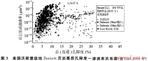 4) 頁(yè)巖氣藏儲(chǔ)層具典型的低孔低滲物性特征,頁(yè)巖產(chǎn)層厚度一般為15~100m,孔隙度一般為4%~6%,滲透率小于0.001×10-3μm2(見圖3)。處于斷裂帶或裂縫發(fā)育帶的頁(yè)巖儲(chǔ)層滲透率可以增加,孔隙度最高可達(dá)11%,滲透率可達(dá)1×10-3μm2左右[1]。據(jù)美國(guó)主要頁(yè)巖氣產(chǎn)層儲(chǔ)層物性統(tǒng)計(jì),孔隙度為4.22%~6.51%,滲透率為40.9×10-6μm2。
