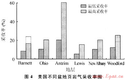 據(jù)美國(guó)5個(gè)主要頁(yè)巖氣產(chǎn)氣盆地的統(tǒng)計(jì),頁(yè)巖氣藏的采收率變化范圍為5%~60%(見圖4)。如埋藏較淺、地層壓力較低、有機(jī)質(zhì)豐度較高、吸附氣含量較高的Antrim頁(yè)巖氣藏的采收率可達(dá)60%;而埋藏較深、地層壓力較高、吸附氣所占比例相對(duì)較低的Barnett頁(yè)巖氣藏的采收率早期為7%~8%,隨著水平井和壓裂技術(shù)的進(jìn)步,目前的采收率達(dá)到16%,預(yù)計(jì)最終可達(dá)25%左右。