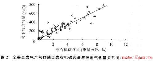 2) 頁(yè)巖氣主要由吸附氣和游離氣兩部分組成。其中基質(zhì)孔隙和裂縫中的游離氣的儲(chǔ)集方式與常規(guī)天然氣儲(chǔ)層相似;有機(jī)質(zhì)與黏土顆粒表面的吸附氣的儲(chǔ)集方式與煤層氣相似。不同地質(zhì)條件下游離氣與吸附氣的相對(duì)比例有很大差別[2]。影響游離氣量大小的主要因素是頁(yè)巖基質(zhì)孔隙的大小和天然裂縫的發(fā)育程度,二者為正相關(guān)關(guān)系;影響吸附氣多寡的關(guān)鍵因素是有機(jī)碳含量的高低,二者同樣具正相關(guān)性(見圖2)。