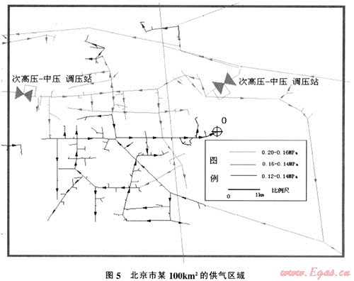 如圖5所示為北京市某區(qū)域天然氣管網圖,其供氣區(qū)域約為100km2。此區(qū)域內中壓管網氣源,為兩座高中調壓站,供應壓力為0.2MPa,高時總負荷70000(m3/h),負荷點422個.根據(jù)管網模擬軟件計算可知末端壓力為0.131MPa。處于該區(qū)域的東部(如上圖黑管線)。根據(jù)規(guī)劃此區(qū)域內負荷將有明顯的增加.因此.必須提早做出切實可行的管網改造方法。