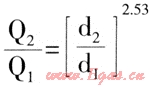 舊有的管網系統(tǒng)中管徑較小的管道有可能是制約管網通過能力的瓶頸。通過管網計算,北京市中壓管網主干線個別管段由于管徑較小,嚴重阻礙了管網輸送,應將此管段進行擴徑,如香山南路管線,管徑為DN400。全長4000m。其中有一段DN100,導致附近壓力偏低,若將此段管線改為DN400,附近壓力由0.04MPa,升到0.06MPa。圖5所示為擴大管徑對管輸能力提高倍數(shù)的影響,計算式: