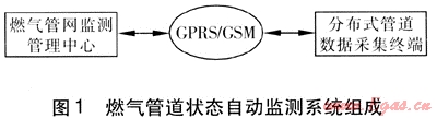 燃?xì)夤艿罓顟B(tài)自動(dòng)監(jiān)測系統(tǒng)包括監(jiān)測管理中心、GPRS/GSM(GPRS為通用分組無線業(yè)務(wù),GSM為全球移動(dòng)通信系統(tǒng))、分布式管道數(shù)據(jù)采集終端,系統(tǒng)組成見圖1。