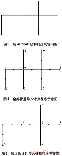 目前已有利用Visual C++開(kāi)發(fā)的水力計(jì)算程序,可以在可視化界面中由用戶(hù)利用鼠標(biāo)點(diǎn)擊繪制管網(wǎng)計(jì)算圖。在管段和節(jié)點(diǎn)附近的空間范圍內(nèi)雙擊鼠標(biāo)左鍵,彈出相應(yīng)對(duì)話(huà)框,輸入管段和節(jié)點(diǎn)參數(shù),實(shí)現(xiàn)管網(wǎng)和數(shù)據(jù)的緊密結(jié)合。同時(shí)程序具有管段刪除、截?cái)唷⒏淖冾伾?、流向等編輯功能,方便管網(wǎng)的新建和改建。并利用解節(jié)點(diǎn)方程組法對(duì)單氣源與多氣源、高中壓與低壓、環(huán)狀與枝狀管網(wǎng)進(jìn)行快速、準(zhǔn)確的水力計(jì)算,并可將結(jié)果自動(dòng)標(biāo)注在水力計(jì)算圖中[2]。本文在此程序基礎(chǔ)上開(kāi)發(fā)管網(wǎng)拓?fù)浣Y(jié)構(gòu)圖的自動(dòng)導(dǎo)入功能。