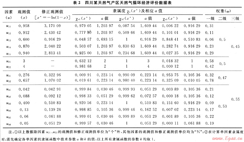 以四川某天然氣產(chǎn)區(qū)為例,通過(guò)到天然氣生產(chǎn)企業(yè)和相關(guān)政府部門(mén)調(diào)研討論,并依據(jù)各單因素指標(biāo)數(shù)據(jù)以及各指標(biāo)權(quán)重,計(jì)算各方面數(shù)據(jù),整理如表2。