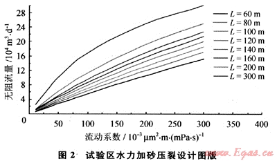 采用節(jié)點(diǎn)模型開(kāi)展地層流動(dòng)物性與裂縫長(zhǎng)度之間相關(guān)性分析、預(yù)測(cè)不同裂縫與地層匹配情況下的無(wú)阻流量、根據(jù)前期試驗(yàn)成果及微型注入測(cè)試分析,建立了試驗(yàn)區(qū)壓裂設(shè)計(jì)圖版(圖2),該圖版與現(xiàn)場(chǎng)試驗(yàn)結(jié)果具有很好的一致性。