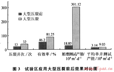 該氣藏通過(guò)大型壓裂,獲得了顯著的增產(chǎn)效果及較高的開(kāi)采效益,圖3是該氣藏應(yīng)用大型壓裂前后效果對(duì)比圖。