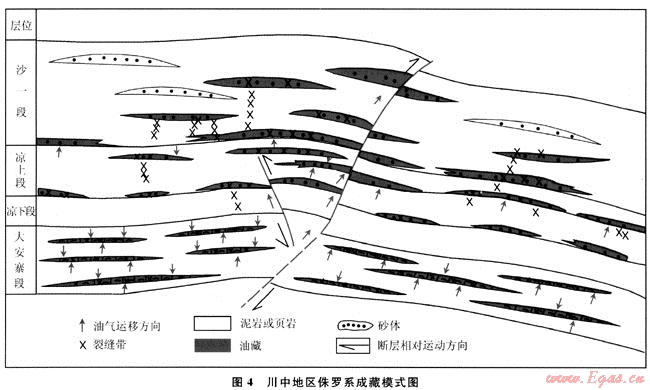 川中地區(qū)侏羅系油藏形成主要受油源區(qū)、斷裂或裂縫及儲集體三要素控制。儲集體是基礎,斷裂或裂縫是橋梁。大安寨段及涼高山組生油層生成的油就近運移形成自生自儲型油藏。介殼灘或砂體發(fā)育的三角洲前緣、濱淺湖亞相分布帶與構造裂縫發(fā)育帶疊加區(qū)是油氣富集區(qū)。涼高山組頁巖生成的油可直接向覆于其上的沙溪廟底部砂巖排烴而形成“下生上儲”式油藏。涼高山組或大安寨段生成的原油沿斷裂及伴生的裂縫帶繼續(xù)上移至沙溪廟組底以上的河道砂體或濱淺湖灘壩而形成次生油藏。成藏模式如圖4所示。