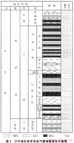 川中地區(qū)侏羅系儲層多層段分布,珍珠沖段砂巖、東岳廟段石灰?guī)r、大安寨段石灰?guī)r、涼高山組砂巖及沙溪廟組砂巖構成了重要的產油層。沙溪廟組、蓬萊鎮(zhèn)組是川西南部侏羅系主要氣層;川東北地區(qū)目前主要在上沙溪廟組獲得氣藏。